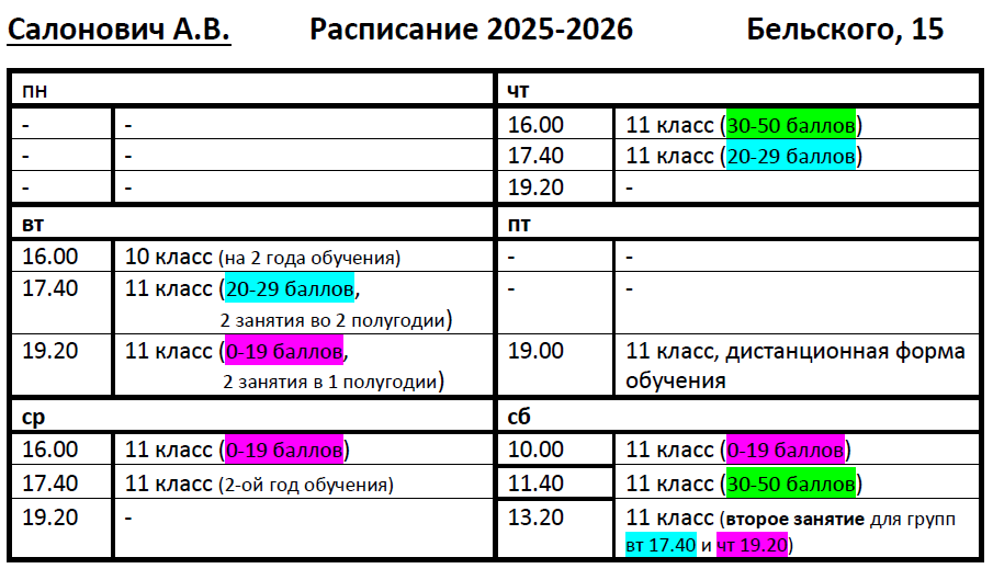 | ЦТ | Суббота 10:00 | Русский язык | ул. Бельского, 15 | 11 класс |
